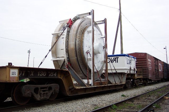 load appears to be a large bearing for a ship. The switcher is a Plymouth. The last two photos show an inter