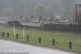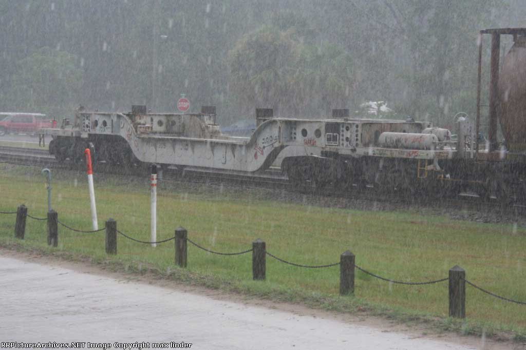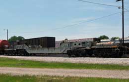 This twelve axle well flat car is owned by ABB. It is used to transport a specific type