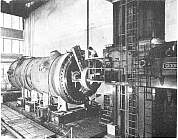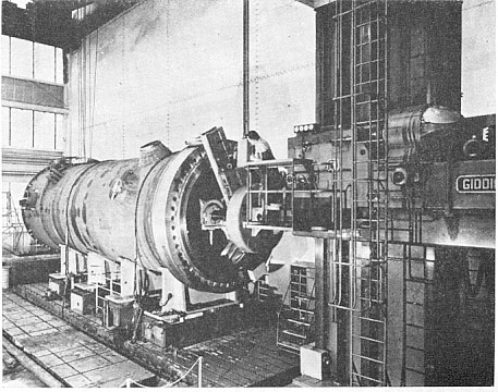 Machining the huge vessel to close tolerances was done on outsize machine tools like this one in the Barberton plant of Babcock & Wilcox. |