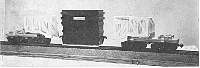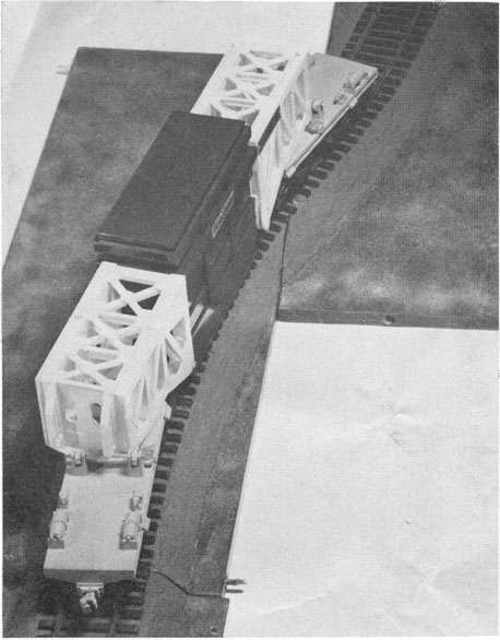 In the absence of a crane, the transformer can be blocked up on any straight stretch of track, so that its bottom is 12 inches off the rails. Then the two halves of the car are brought up to it, and hooked on, using the small jacks. Then the big jacks lift the load off the cribbing, the cribbing is removed, and the jacks withdrawn.
