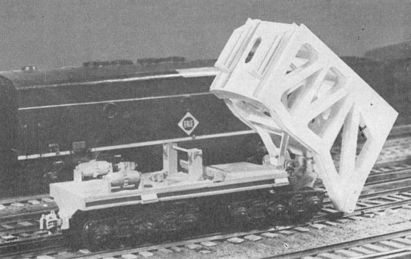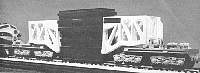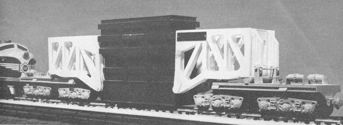 Although the car is 90 feet between coupler faces when loaded with a 28-foot long transformer, it moves through sharp curves like a 50-foot long box car. |