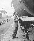Harry Summers and E. D. Walsh direct train crew as wires were lifted over load. |