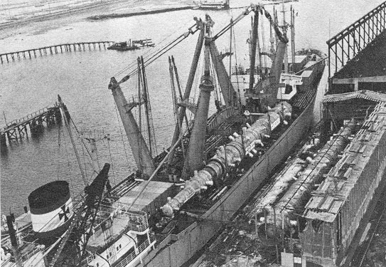 Postscript on a big move - A recent issue of The Post told about the movement of a 190-foot oil refining heat-exchanger vessel by Penn Central people at Wilkes-Barre, Pa. Above photo, courtesy of the publication, Via Port of New York, shows the giant item aboard ship, while a second waits on the dock for loading. Destination: An Esso Standard refinery in Libya, Africa.