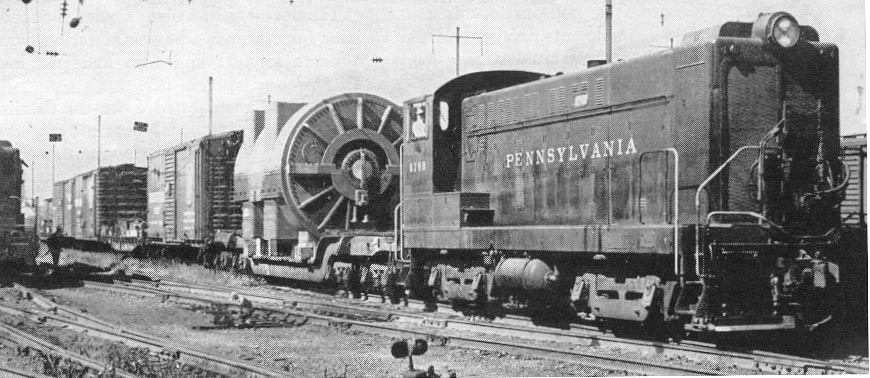 PRR switching crew moves generator of 191,000-kilowatt capacity for delivery to plant. |