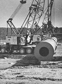 Huge mobile cranes move a rotary kiln into place at the new Andersonville (Ga.) plant of Mullite Company of America. The kiln, used for processing kaolin clay, is one of two to be installed. |