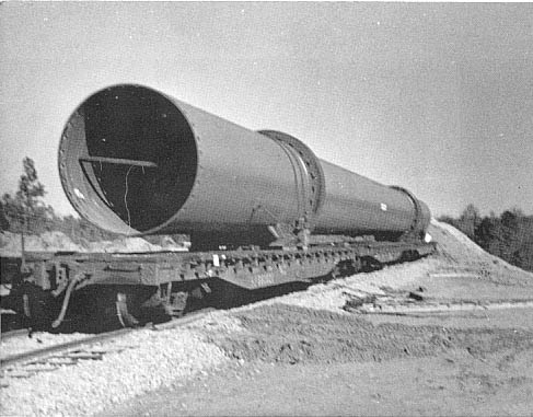 The rotary kiln measured 150 feet long and 8 feet in diameter and required three flatcars for its movement over Southern from Cincinnati, Ohio, to Andersonville. |