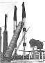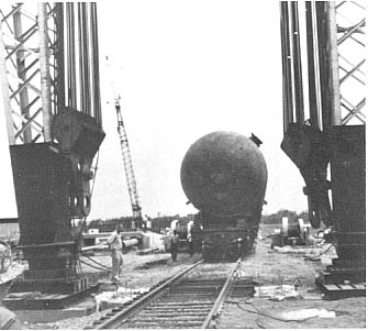 "The track led right up to where the absorber was to be erected," explained Charles C. Smoot, transportation assistant, Control and Coordination Center, Atlanta. "Cranes on each side of the track began lifting the giant absorber as the cars were run under them. Then when workers got the absorber erect, the cars were pulled out, the track removed, and the huge vessel placed on its foundation."