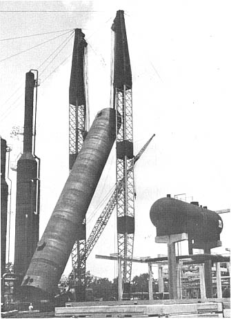 Strong cranes lifted the 600-ton absorber to an erect position at the refrigerated absorption plant. |