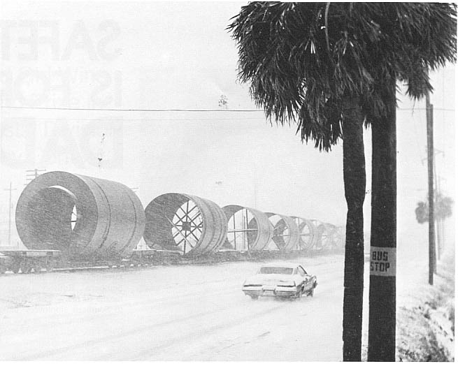 A record seven inches of white stuff fell on Charleston, where Southern Railway picked up a 580-foot-long kiln. Sectionalized in 16 pieces plus riding rings, the kiln is the largest load Southern has carried in terms of height, width and distance moved.