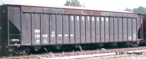This photo of a 100 ton 68'9" Wood Chip Hopper was taken in Nixon Yard Augusta, GA, September 1997 by Tom Daspit. Built in 1969 by Magor. Car numbers in the current series are 133000-133199.