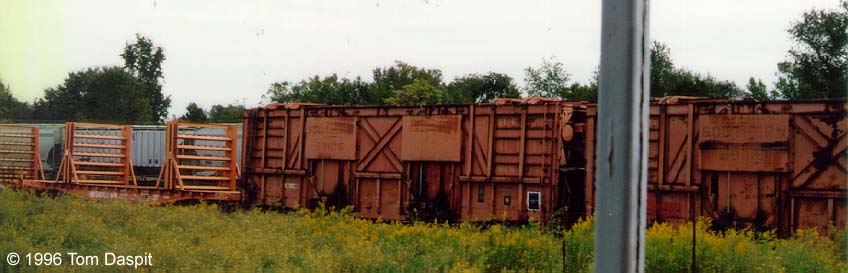 This photo of Continuous Welded rail and track panel cars was taken by me at Spencer, NC during September 1996. This picture was take from the back platform of a caboose, during Rail Days in 1996.