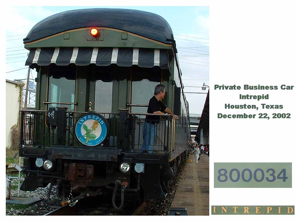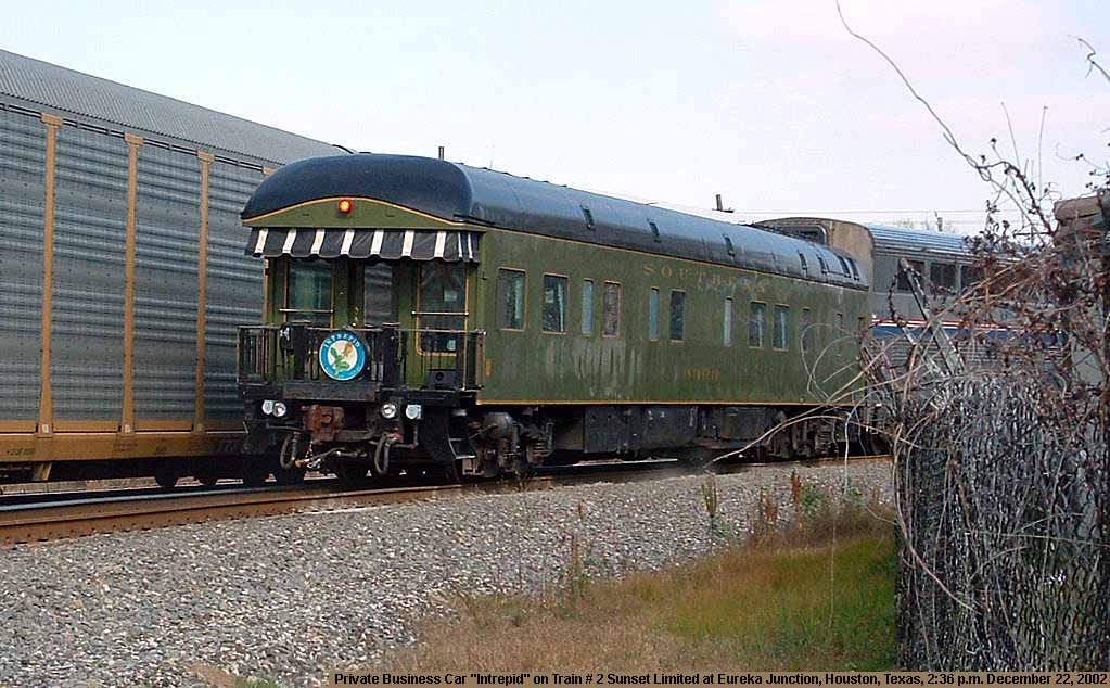 This picture was posted to alt.binaries.pictures.rail by Bryan Flint. Private Business Car "Intrepid" on Train # 2 Sunset Limited at Eureka Junction, Houston, Texas, 2:36 p.m. December 22, 2002 Private Business Car "Intrepid" on Train # 2 Sunset Limited at Eureka Junction, Houston, Texas, 2:36 p.m. December 22, 2002.
