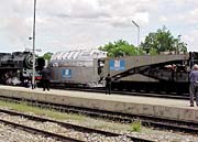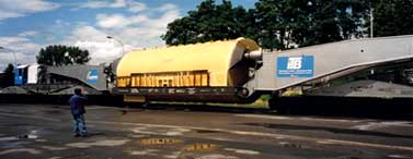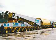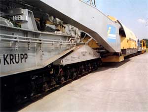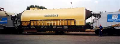 | In the German Muelheim A. D Ruhr a generator stand was shipped including course belt support frames with a hanging up weight by 475 tons by Siemens KWU on a 32-achsigen carrying bill car. The dead weight of this carrying bill car is with 215 tons, which makes it European-wide the easiest 32-Achser. This is of special importance in connection with the total weight and the Achs and meter loads possible of the clearing race. | ||