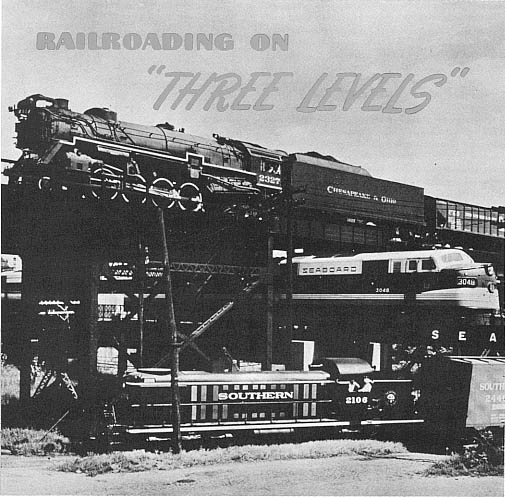 What looks at first glance like a photographer's idea of a practical joke is really a picture of what is probably the only three-Ievel railroad crossing any- where. Ii. Richmond, Virginia, just south of Main Street Station at Byrd Street, tracks of three railroads-the Southern, the Seaboard and the Chesapeake and Ohio- intersect at three separate levels.