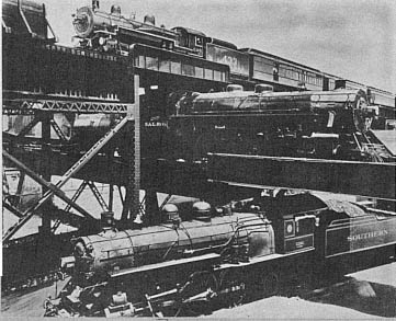 On the "ground floor" runs the main line of the Southern's Richmond division, tracks first laid in 1861. Pass- ing above it on a viaduct is the main line of the Seaboard Air Line Railroad's Virginia division. Above that, on one of the longest railroad trestles in North America, sweeps the main line of the James River division of the Chesapeake and Ohio. Both the C&O overpass and the Seaboard viaduct-which is both overpass and under- pass-were built in 1900.