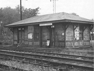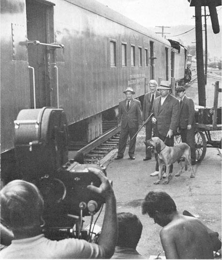 Locomotive 4501 pulls into the depot at "Glory," W. Va., as the camera records a scene with George Kennedy (with dog) and (from left) Strother Martin, Jimmy Stewart and Kurt Russell. |