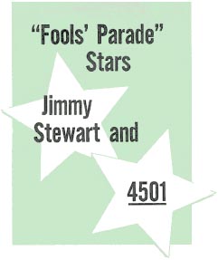 Along with Mr. Stewart, Mr. Kennedy, Miss Baxter and a host of other top flight motion picture actors, locomotive 4501 stars in a Columbia Pictures film, "Fools' Parade," due to appear in theaters late next spring or early summer.